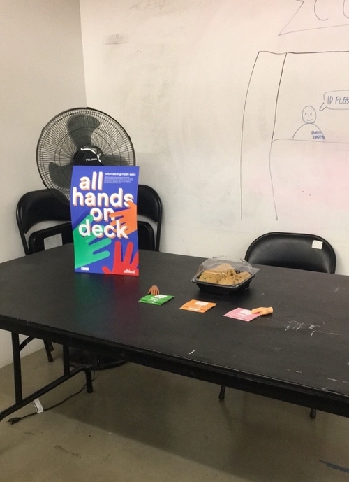 Finally, it was time to bring our vision to life. For Allhands, we wanted four different touchpoints to be part of the experience: posters and business cards to raise awareness around our service, a physical starter kit that helped the user's volunteering process, and an app for connecting with the community and different organizations while keeping track of and scheduling volunteer hours. Here is where they would sit in a service blueprint: